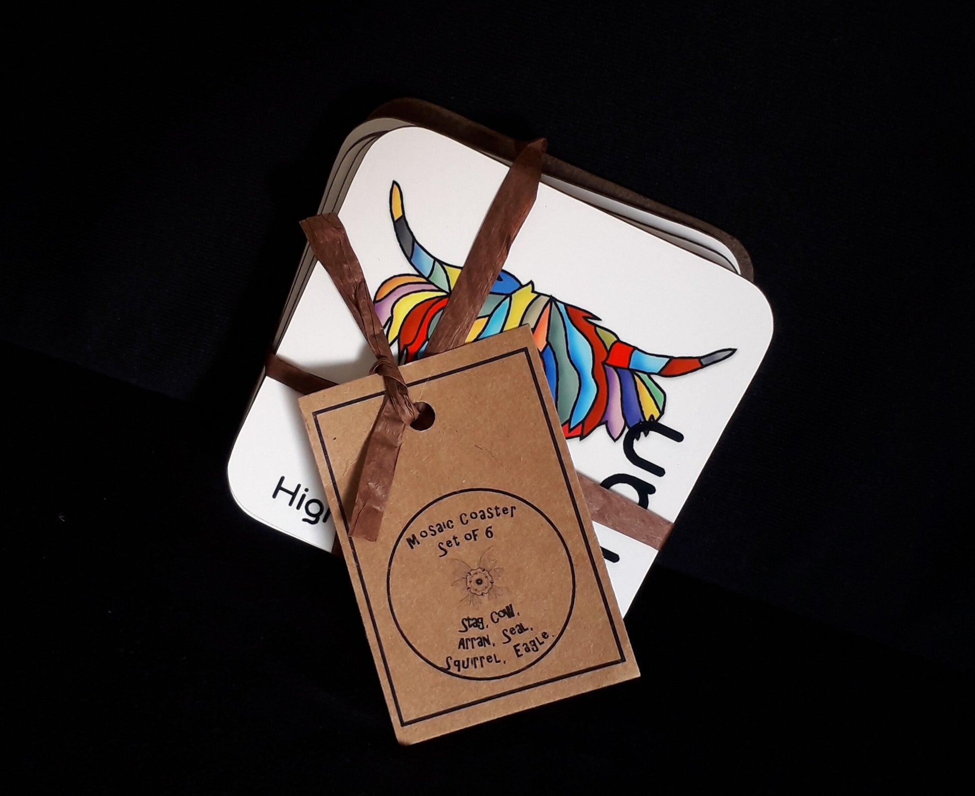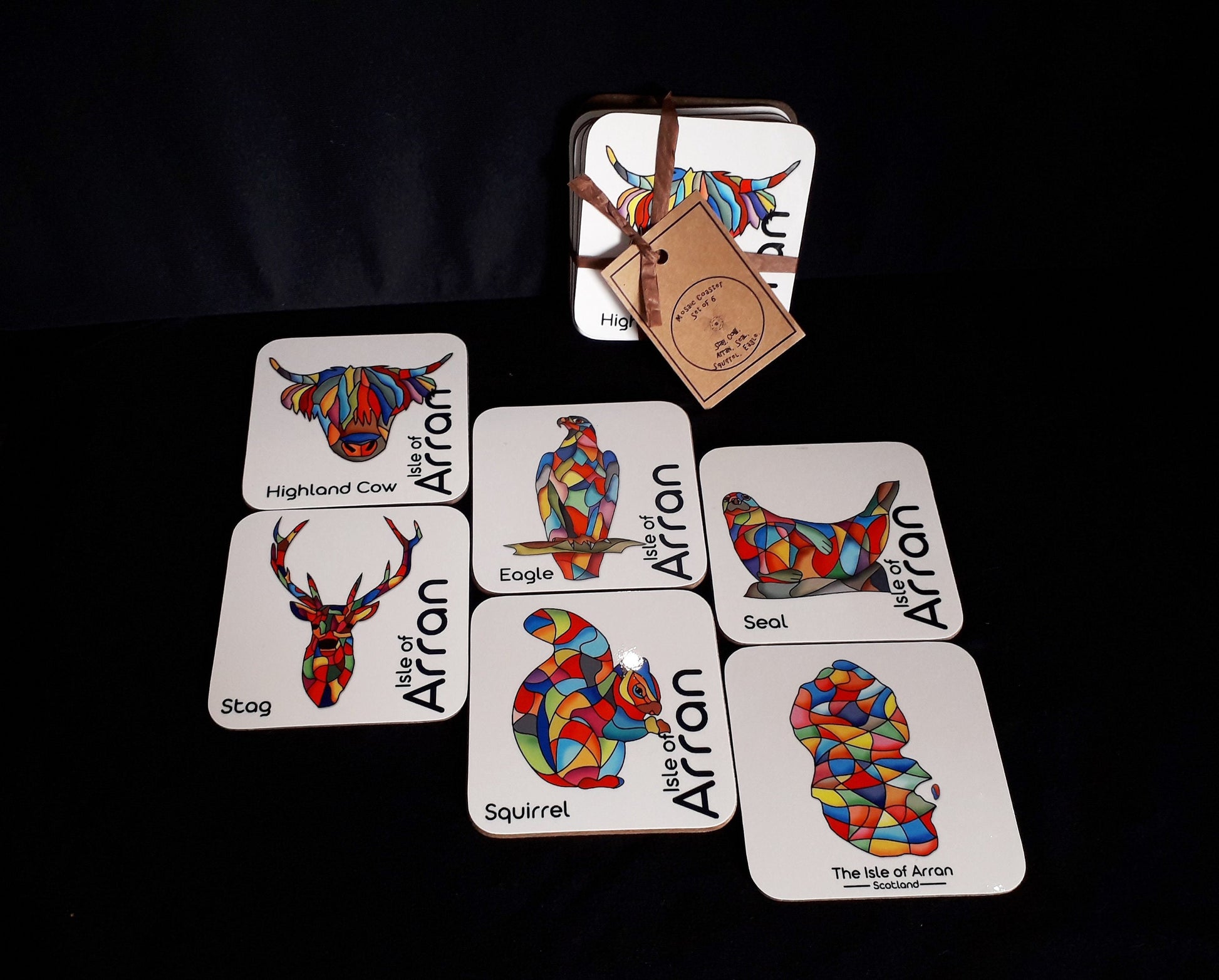 This beautiful set of Arran coasters features some of the animals seen on Arran. The colourful mosaic pattern is bright and cheerful and was designed by Graham Chappell and the coasters are made in our shop of the beautiful Isle of Arran. The set includes Highland Cow, Golden Eagle, Red Deer Stag, Harbour Seal and Red Squirrel and is completed by a map of Arran. The set comes tied with recycled paper ribbon and makes a thoughtful gift for lovers of animals or Arran and is sure to brighten any coffee table.